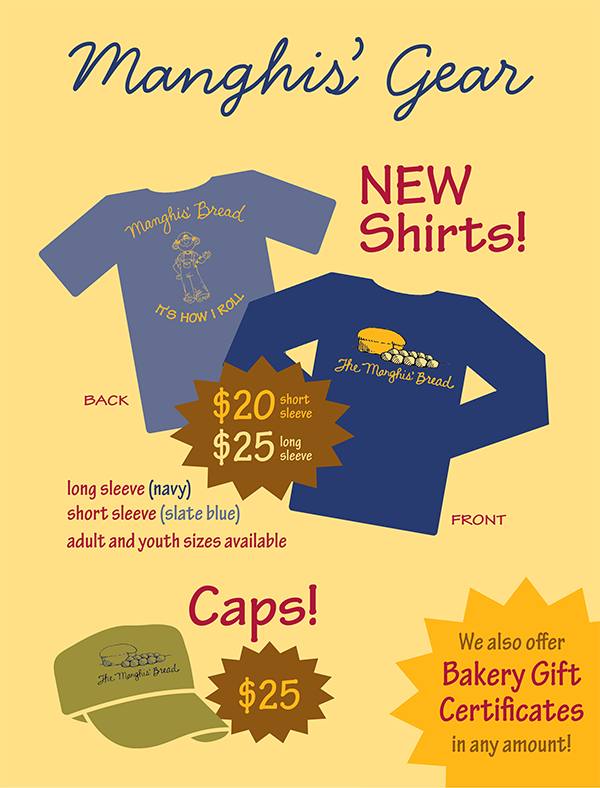 We have long-sleeve and short-sleeve T-shirts in a variety of youth and adult sizes for the Manghis’ lover in your life, featuring Matt Manghi’s cartoon roll connoisseur. Or choose our military-style olive-green cap.